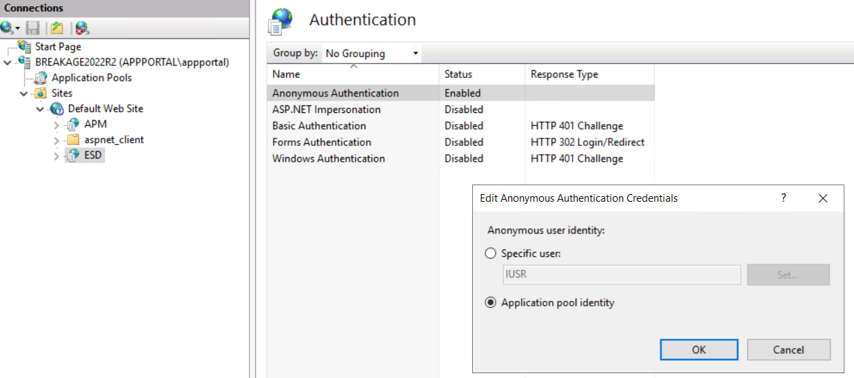 To configure IIS to use anonymous authentication instead of Windows authentication, perform the following steps.