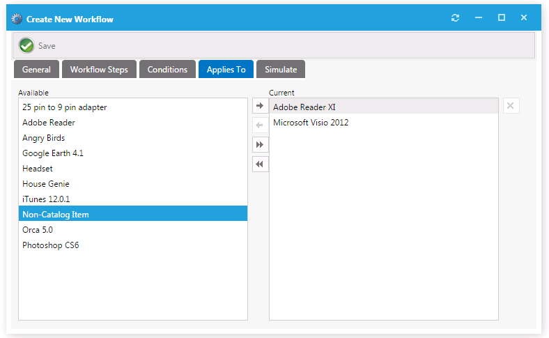Open the Applies To tab, which you can use to identify which catalog items that this workflow applies to.