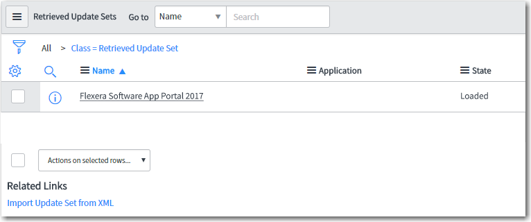 .xmlfile and click Upload. When the upload is complete, the file will be listed on the Retrieved Update Sets page.