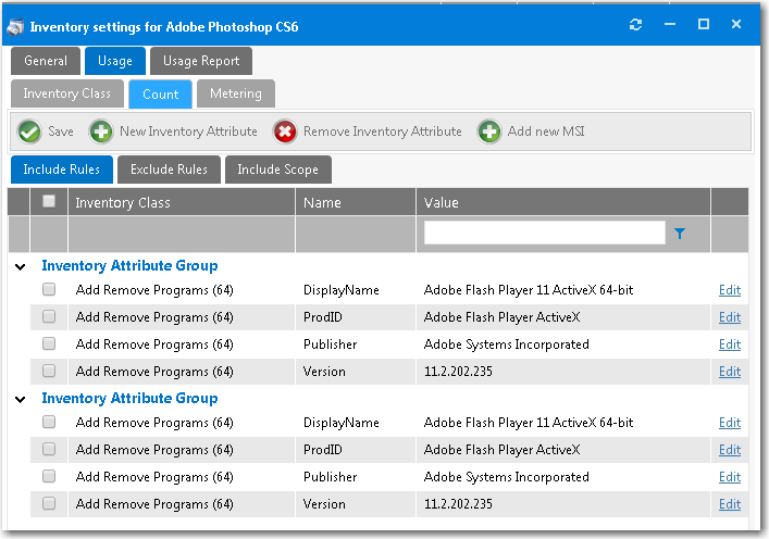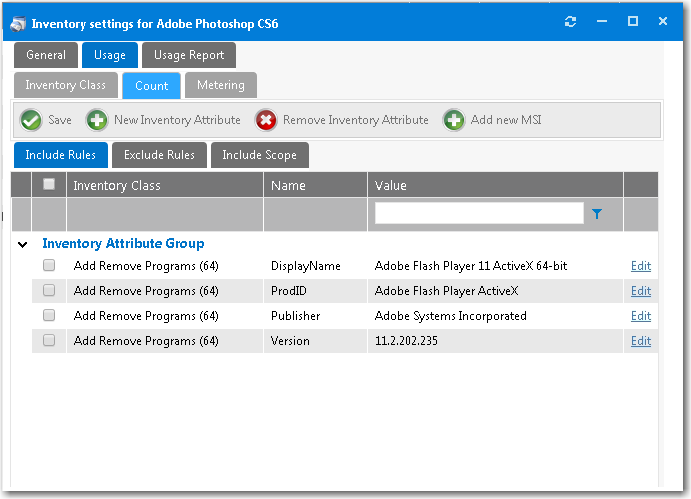 On the Usage > Metering tab of the Inventory Item Properties dialog box, you can select the software metering rule to determine actual user usage of the program.